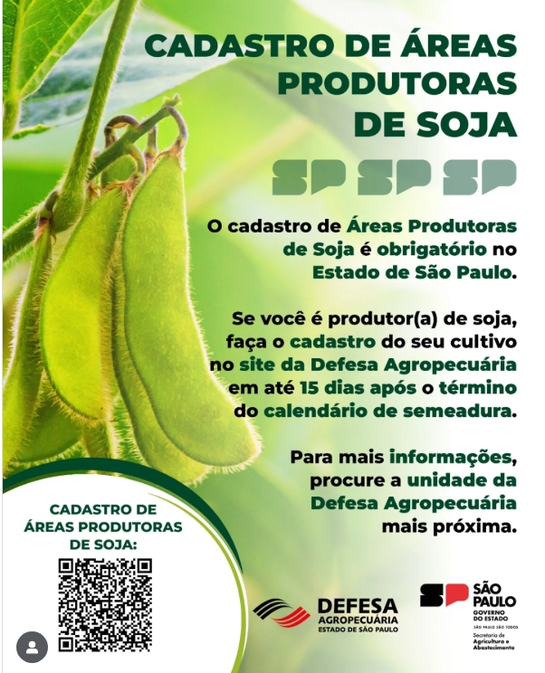 Todos os associados da Cooperativa Agropecuária de Pedrinhas Paulista que plantarem soja na lavoura da Safra 2025/2026 devem fazer o cadastro de seu cultivo no site da Defesa Agropecuária até 15 dias após o término do calendário de semeadura.